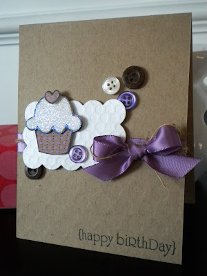 I love, love, love this Little Cupcake from My Cute Stamps! I stamped it on some Dotty Biscotti patterned paper from Papertrey Ink and cut it out. Then, I stamped the cupcake again on some Shimmer White cardstock and cut out the top of the cupcake. Then, I glitter-fied (is that a word? is now!) it with Prisma glitter! Super, super cute! I adhered the cupcake on a shimmery Fillable Frames #5 die cut that I also ran through the Cuttlebug with the Polka Dot Basics Impression Plate! The sentiment is from the Birthday Bash Sentiments. I also love the look of the Plum Pudding Satin ribbon tied together with the twine! I love mixing the rustic, elegant, and cute elements together! So fun!