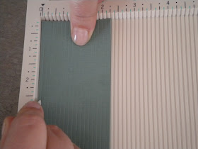 Here I have my MS Score Board with a 5 1/2" by 2 1/4" strip of Ocean Tides cardstock. I lined the cardstock up flush in the corner of the score board. Being sure to hold the cardstock in place, I used the scoring tool to score straight lines every 1/8" for the entire length of the cardstock.